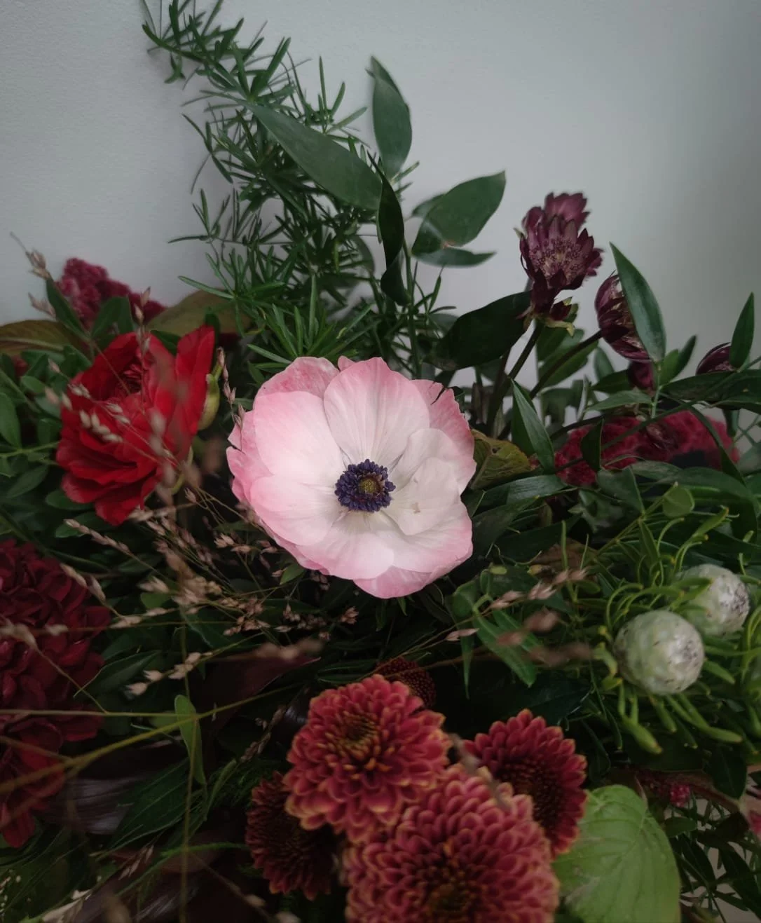 Kimpussa valkoisen amarylliksen seurana runsaasti erilaisia materiaaleja ja tekstuureja savun sinisen ja tummanpunaisen sävyissä. Mm. sinipiikkiputkea, likusteria, ikilatvaa, vahakukkaa ja heinää tukun valikoima huomioiden. Boheemi, hieman villi ja niittymäinen fiilis. Halutessasi sidomme kimppuun lisämaksusta myös kruunuvuokkoja, kultaa, hopeaa tai extra vihreät.